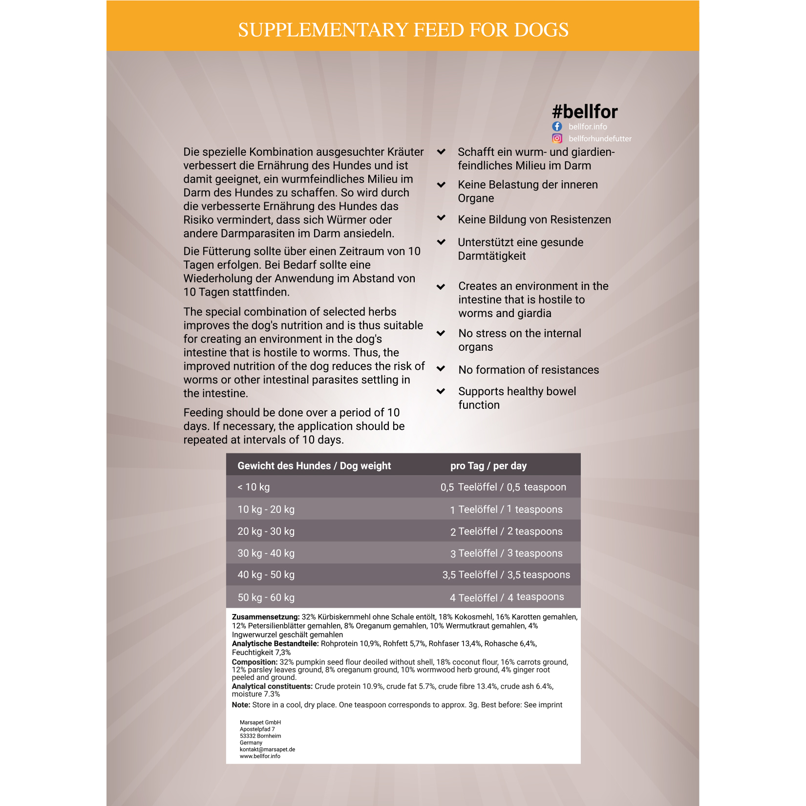 Gleichzeitig ist Bellfor Vermal Pulver gut bekömmlich und belastet den Organismus des Hundes nicht unnötig. Resistenzen sind auch bei mehrmaliger Gabe ausgeschlossen.
