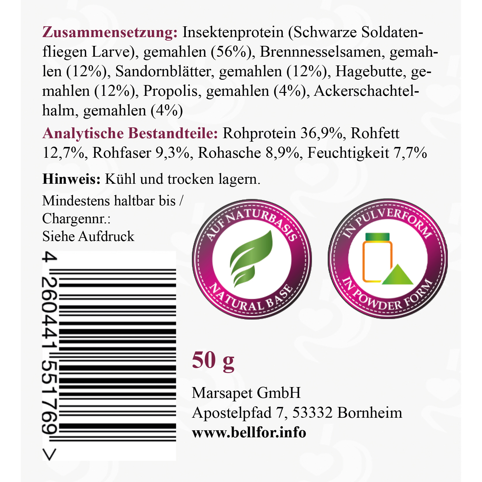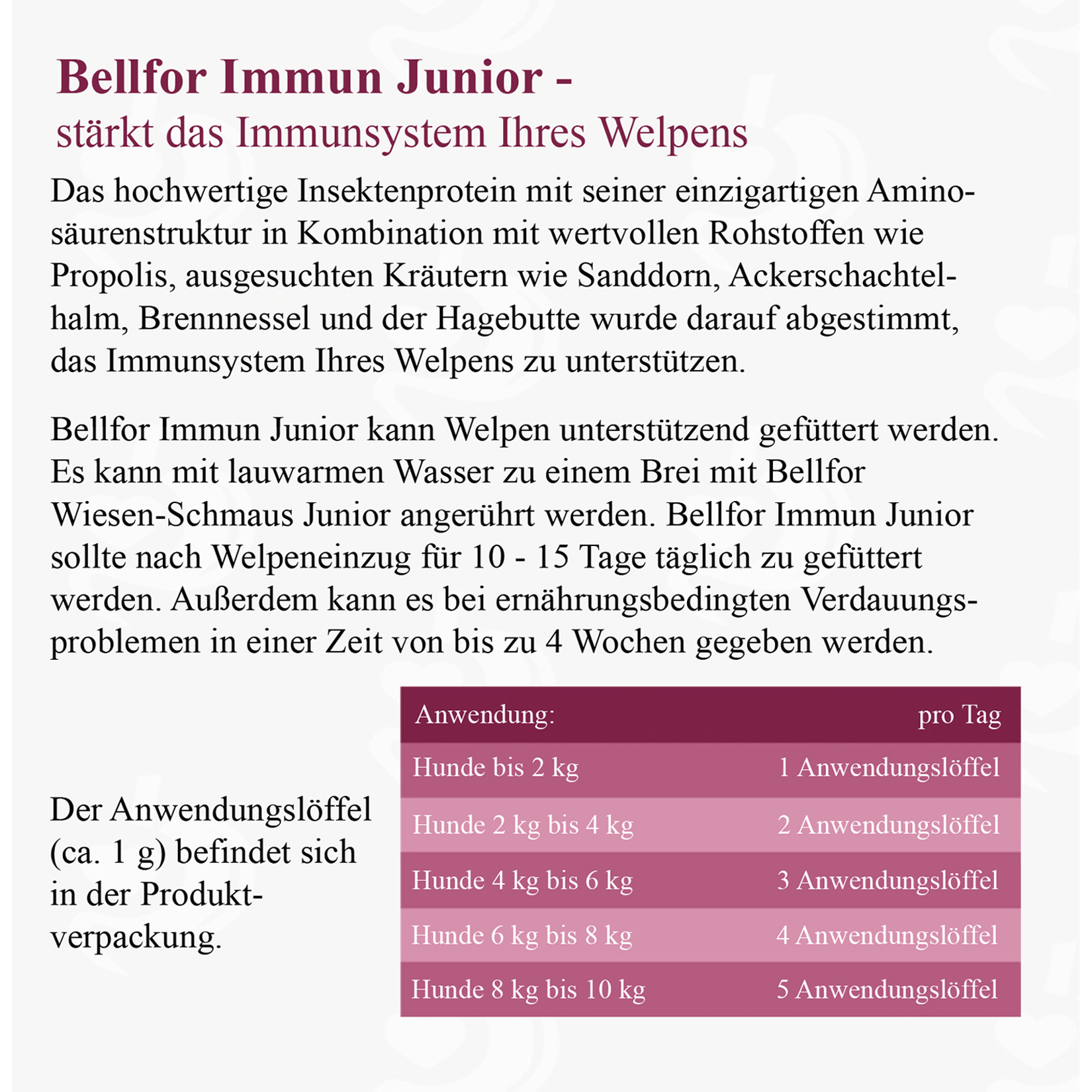 Daher kann unser Bellfor Immun Junior in Pulverform Welpen unterstützend gefüttert werden. Es kann mit lauwarmem Wasser zu einem Brei mit Bellfor Wiesen-Schmaus Junior angerührt werden. Bellfor Immun Junior sollte nach Welpeneinzug für 10 - 15 Tage täglich zu gefüttert werden. Außerdem kann es bei Durchfall und nach Erkrankungen in einer Zeit von bis zu 4 Wochen gegeben werden.