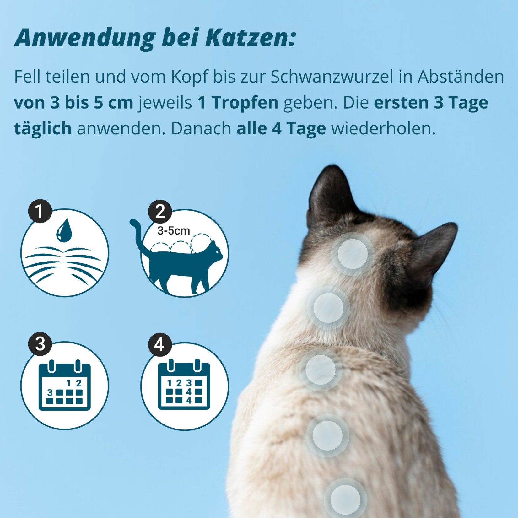 Anwendung bei Katzen: Fell teilen und vom Kopf bis zur Schwanzwurzel in Abständen von 3 bis 5 cm jeweils 1 Tropfen geben. Die ersten 3 Tage täglich anwenden. Danach alle 4 Tage wiederholen.