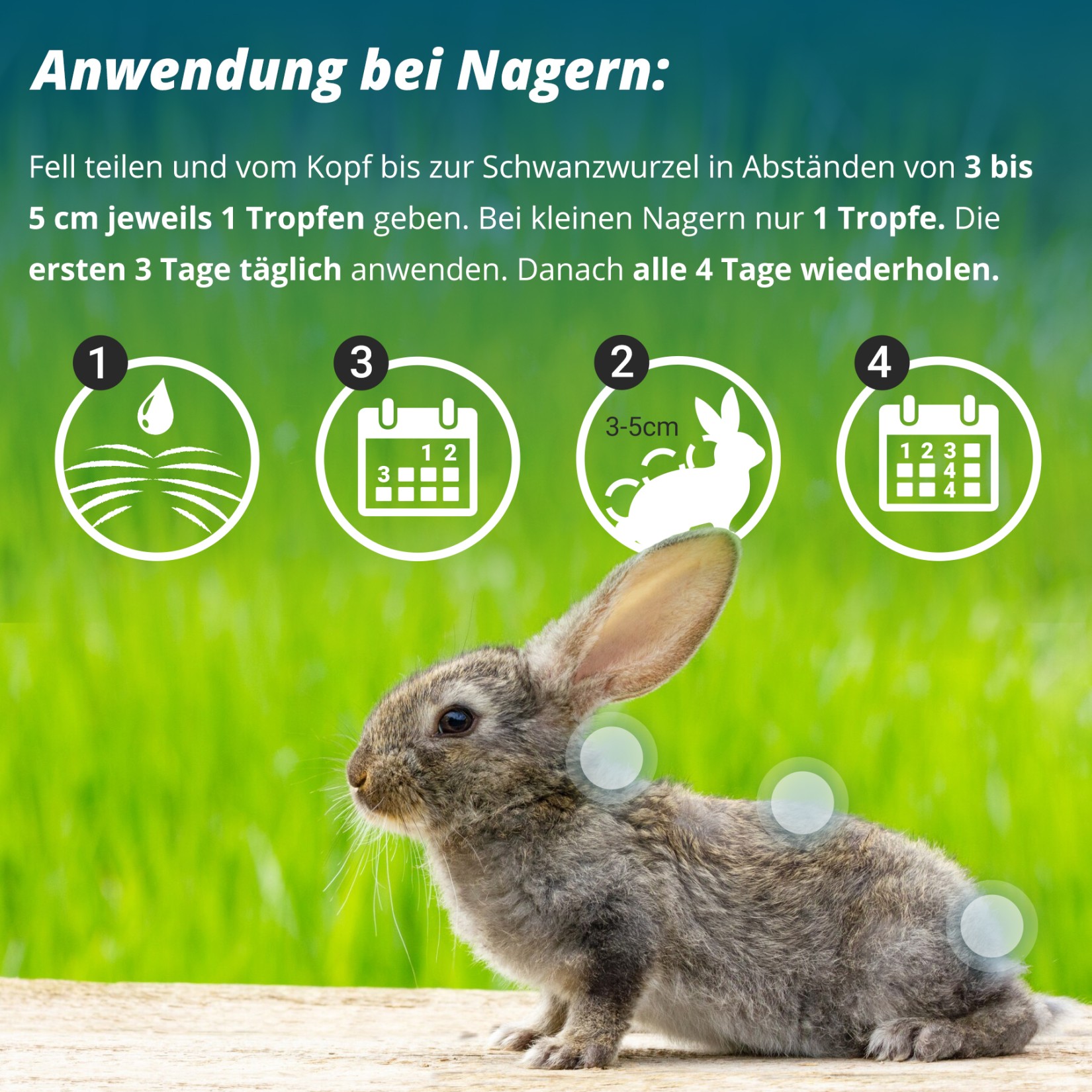 Anwendung bei Nagern- wie: Meerschweinchen, Hamster, Rennmäuse, Frettchen, Chinchillas und Kaninchen: Fell teilen und vom Kopf bis zum Schwanzansatz in Abständen von 2 bis 4 cm jeweils einen Tropfen geben. Bei kleinen Nagern nur einen Tropfen. Die ersten drei Tage täglich anwenden. Danach alle vier Tage wiederholen.