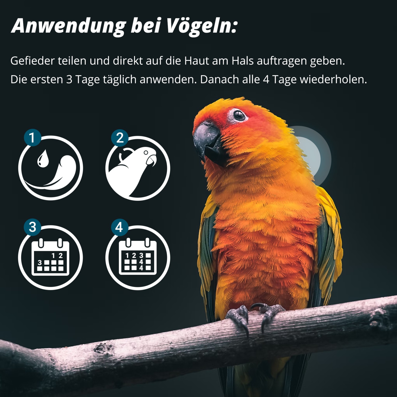 Anwendung bei Vögeln wie: Aras, Sittiche, Finken und Kanarienvögel, sowie Hühnern und Tauben. Gefieder teilen und direkt auf die Haut am Hals auftragen. Die ersten drei Tage täglich anwenden. Danach alle vier Tage wiederholen