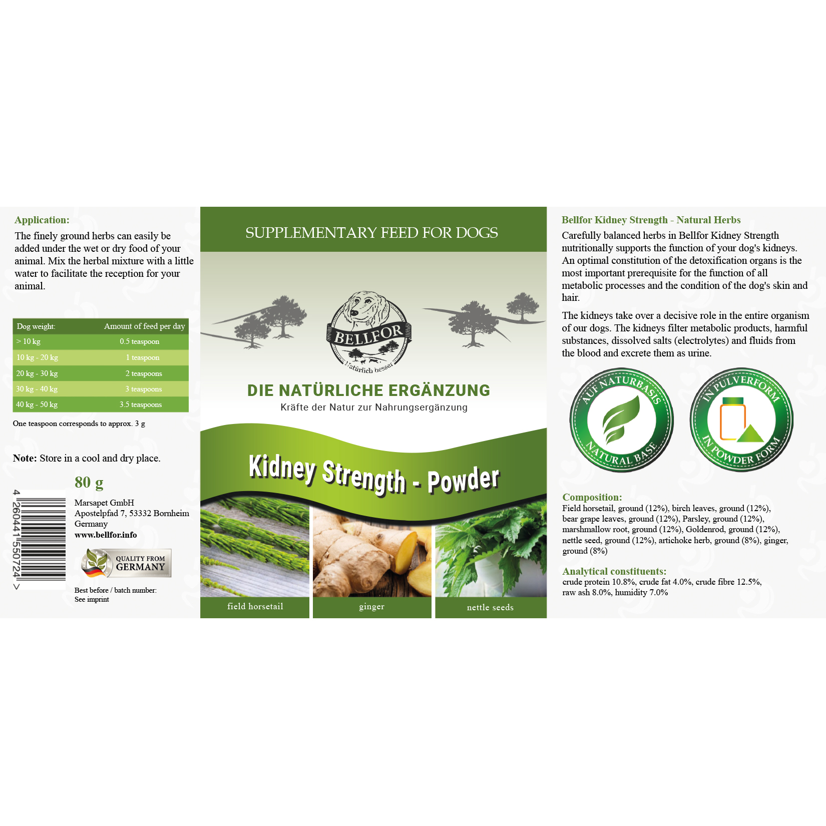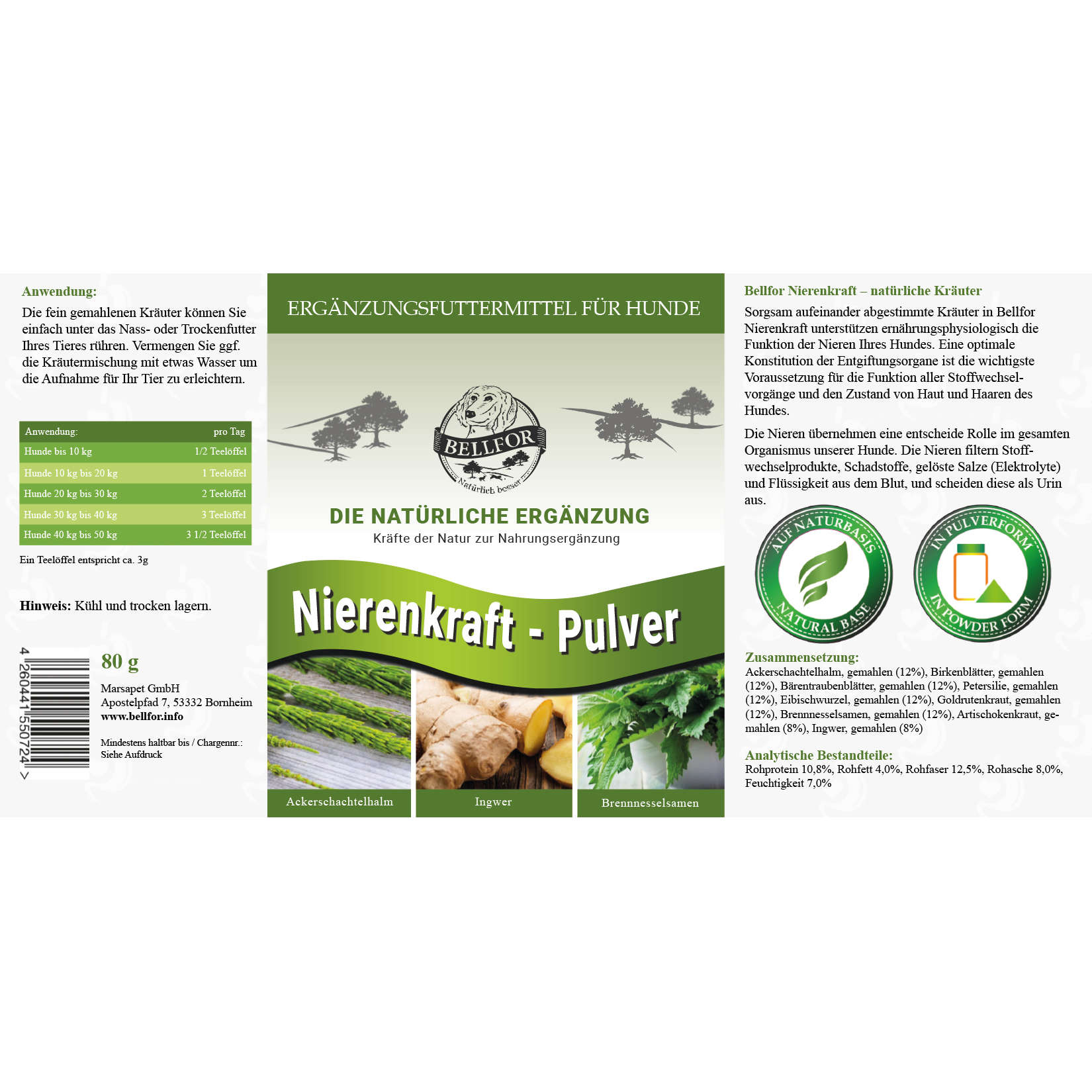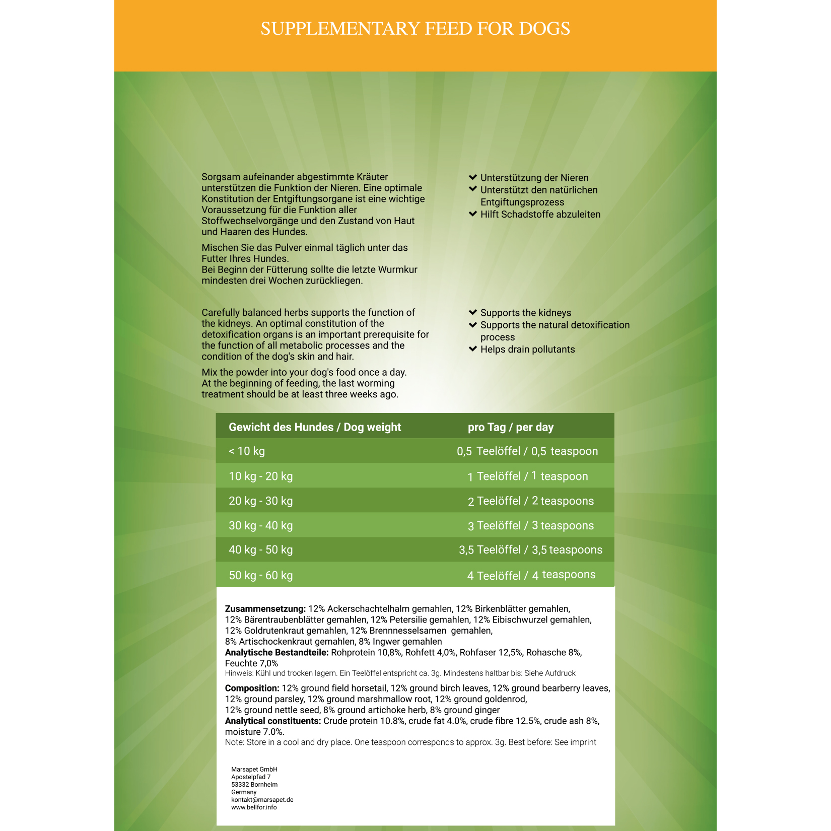 Sorgsam aufeinander abgestimmte Kräuter in Bellfor Nierenkraft unterstützt ernährungsphysiologisch die Funktion der Nieren Ihres Hundes. Eine optimale Konstitution der Entgiftungsorgane ist die wichtigste Voraussetzung für die Funktion aller Stoffwechselvorgänge und den Zustand von Haut und Haaren des Hundes.