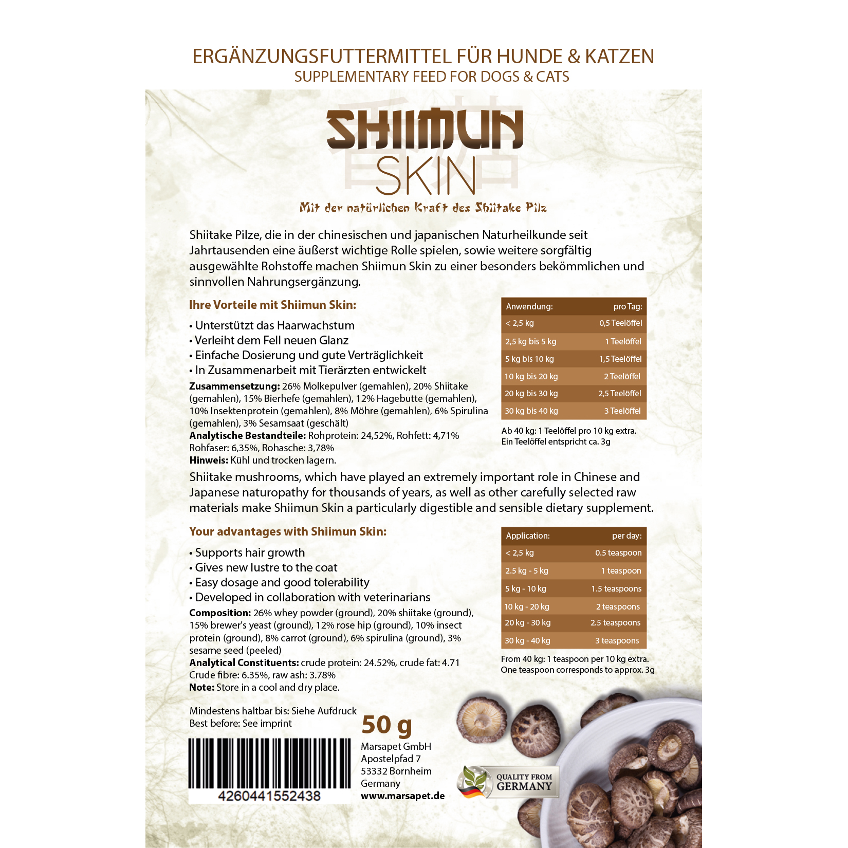 Bei Shiimun Skin handelt es sich um ein natürliches Ergänzungsfuttermittel auf Shiitake-Basis. Das Präparat wurde speziell entwickelt, um Hunde mit zusätzlichen Nährstoffen für die Haut zu versorgen.