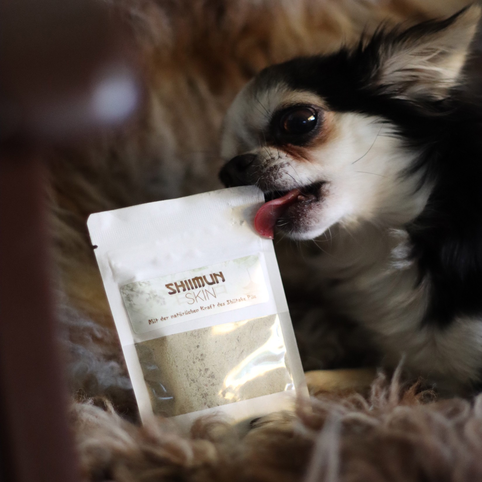 Shiimun Skin ist eine natürliche Ergänzungsfuttermittel für Hunde, die an Problemen mit der Haut und dem Fell leiden. Das Pulver mit Shiitake eignet sich ideal als tägliche Zugabe zum Hundefutter und enthält ausschließlich ausgesuchte hochwertige Zutaten.