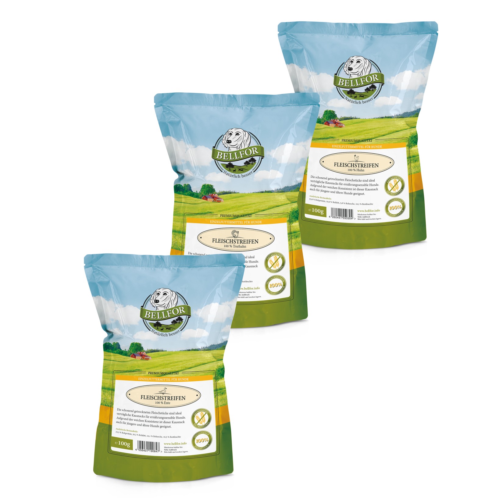Unser Sparset Nr. 1 beinhaltet die drei Bellfor Trockenfleischstreifen Huhn, Truthahn & Ente.