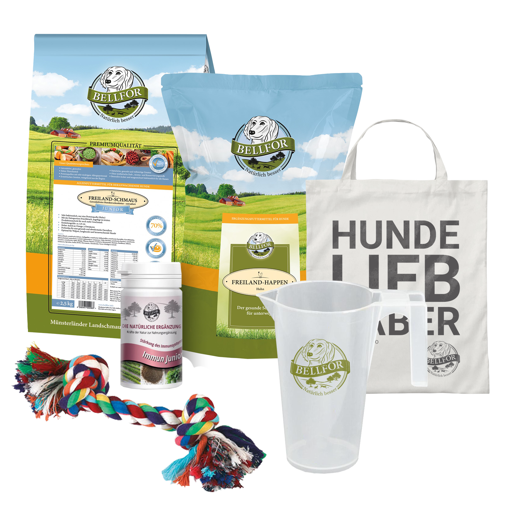 Unser Welpenpaket Freiland-Schmaus Junior Plus, speziell für Sie zusammengestellt, bietet Ihren Welpenkäufern sowie dem Welpen den perfekten Start in den neuen gemeinsamen Alltag.
